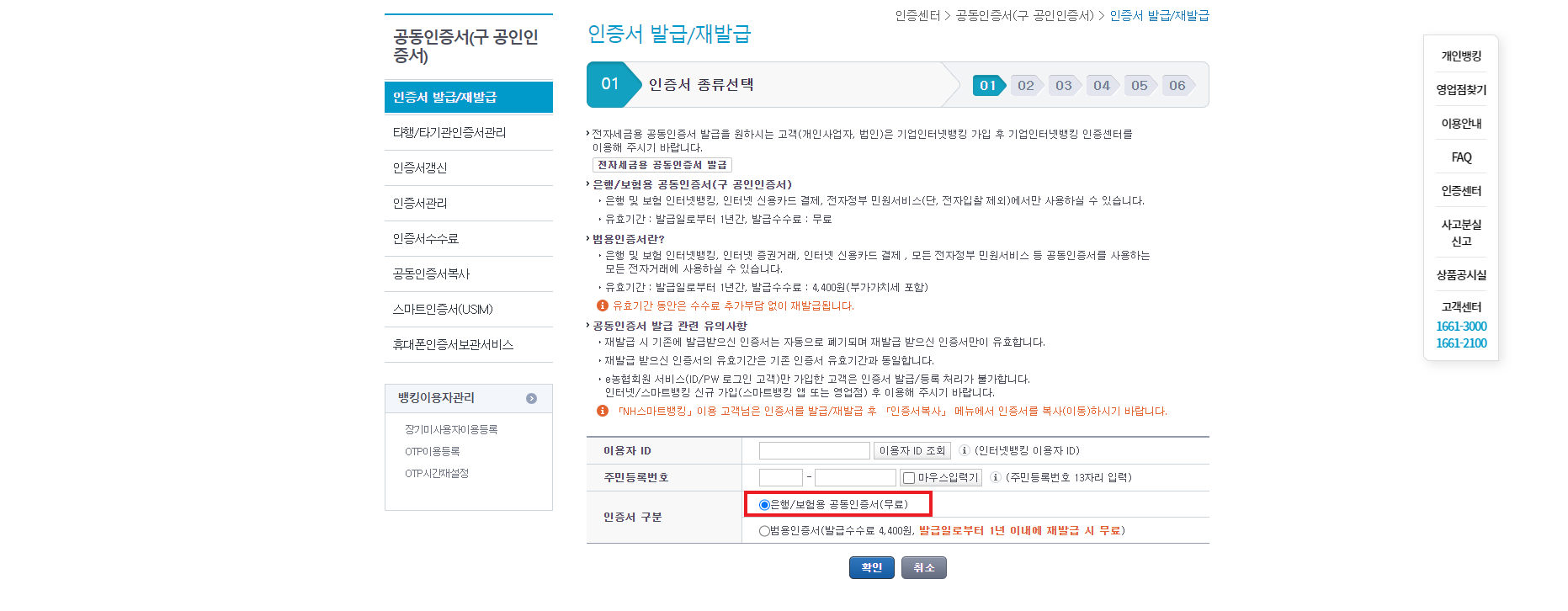 홈페이지에 접속하여 인증서 발급/재발급을 클릭하시면 다음과 같은 화면으로 진행이 됩니다.