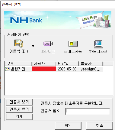 위의 창에 접속하여 붉은색 부분을 클릭하여 진행하시면 됩니다. 인증서 프로그램을 설치하시고 인증서 선택창에 가시면 좌측과 같은 창이 생성됩니다. 인증서 암호를 입력하시면 우측과 같은 창으로 이동이 됩니다.