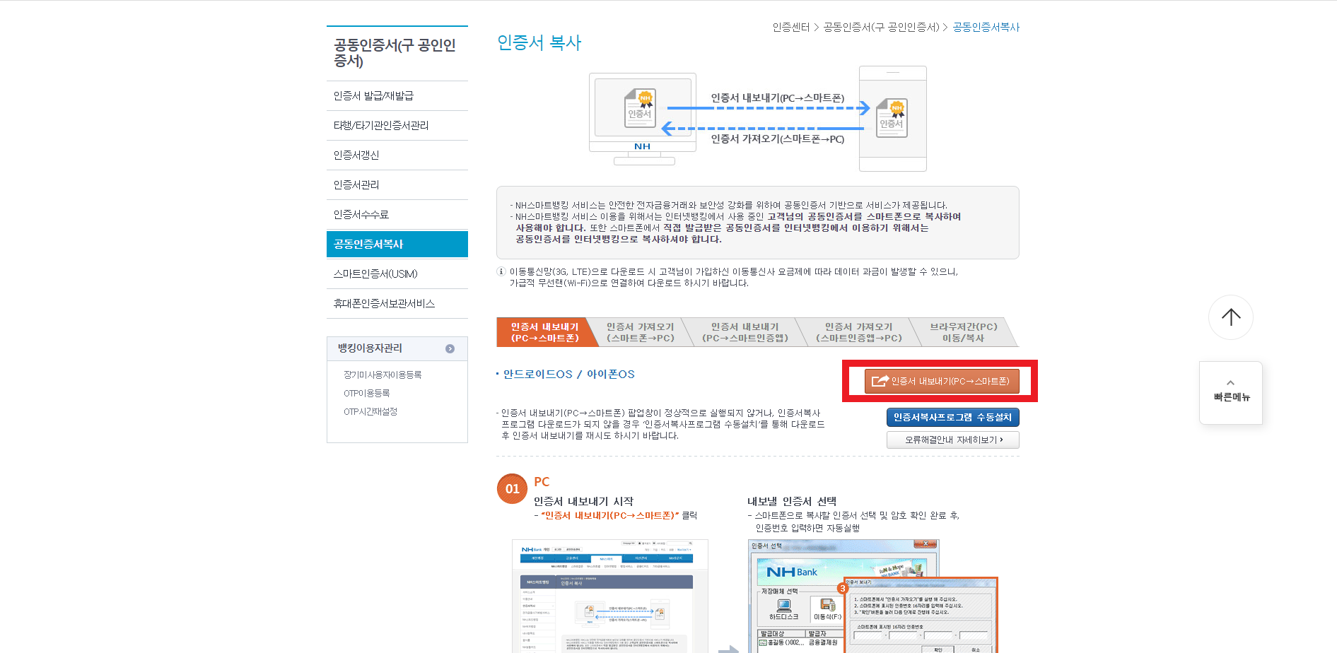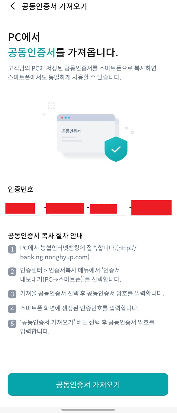 PC로 여기까지 진행을 하셨으면 스마트폰 농협은행 어플로 접속하시면 됩니다. PC에서 스마트폰으로 복사하는 과정은 다음과 같습니다.