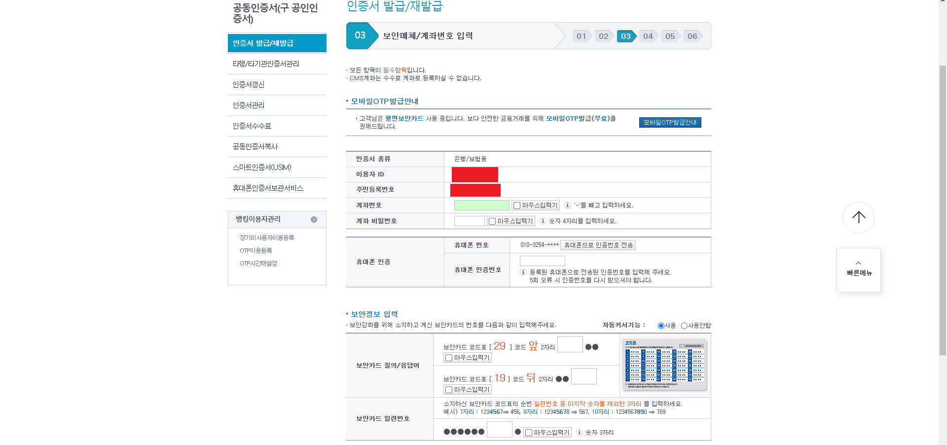 약관동의를 하고 다음페이지로 진행하면 계좌번호, 계좌 비밀번호를 입력하시고 휴대폰 인증을 진행하시고 보안카드를 보고 보안 인증을 해주시면 됩니다. 여기까지 진행하셨다면 이제 거의 다 완료하셨다고 보시면 됩니다. 다음으로 페이지로 넘어가시면 고객정보 입력을 하시면 발급이 완료 됩니다.