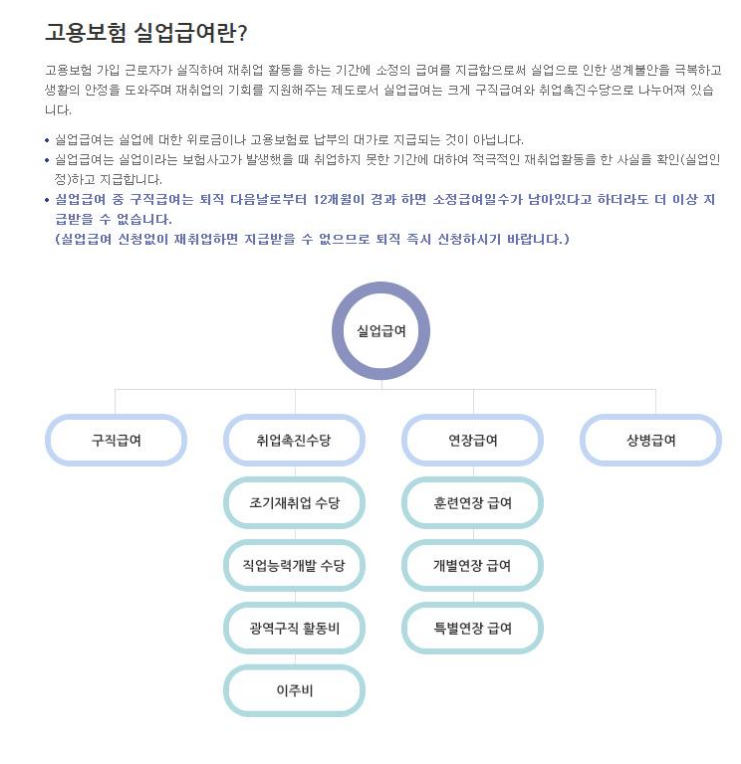 고용보험 가입 근로자가 실직하여 재취업 활동을 하는 기간에 소정의 급여를 지급함으로써 실업으로 인한 생계불안을 극복하고 생활의 안정을 도와주며 재취업의 기회를 지원해주는 제도로서 실업급여는 크게 구직급여와 취업촉진수당으로 나누어져 있습니다.