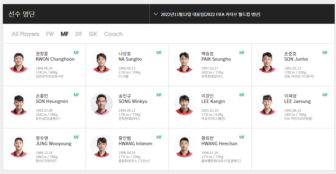 | MF(미드필더) 권창훈(김천상무프로축구단), 나상호(FC서울), 백승호(전북현대모터스), 손준호(산둥 타이샨FC) 손흥민(토트넘), 송민규(전북현대모터스), 이강인(마요르카), 이재성(FSV마인츠05) 정우영(알 사드), 황인범(올림피아코스), 황희찬(울버햄튼원더러스) |