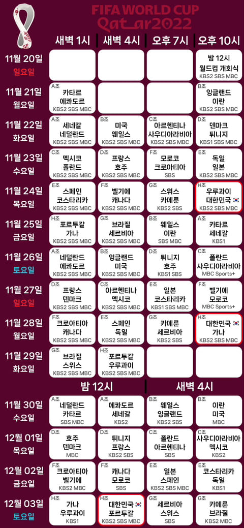 전체적인 월드컵 일정입니다. 11월 20일부터 29일 까지 진행되는 시간은 01:00AM, 04:00AM, 19:00PM, 22:00PM으로각기 다른 시간대에 4경기씩 진행이 됩니다. 11월30일 부터 12월 3일까지는 00:00AM, 04:00AM에 동시간대에 두경기씩 진행이 됩니다. 아래 표로 정리해 보았습니다.