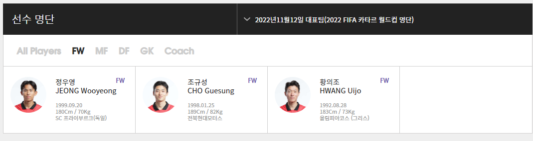 | FW(공격수) 정우영(SC 프라이부르크) 조규성(전북현대모터스) 황의조(올림피아코스) |