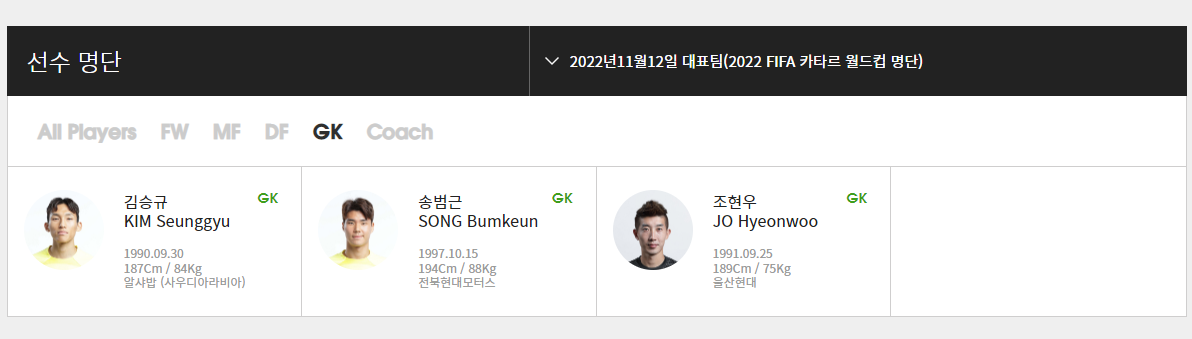 | GK(골키퍼) 김승규(알 샤밥) 송범근(전북현대모터스) 조현우(울산현대) |